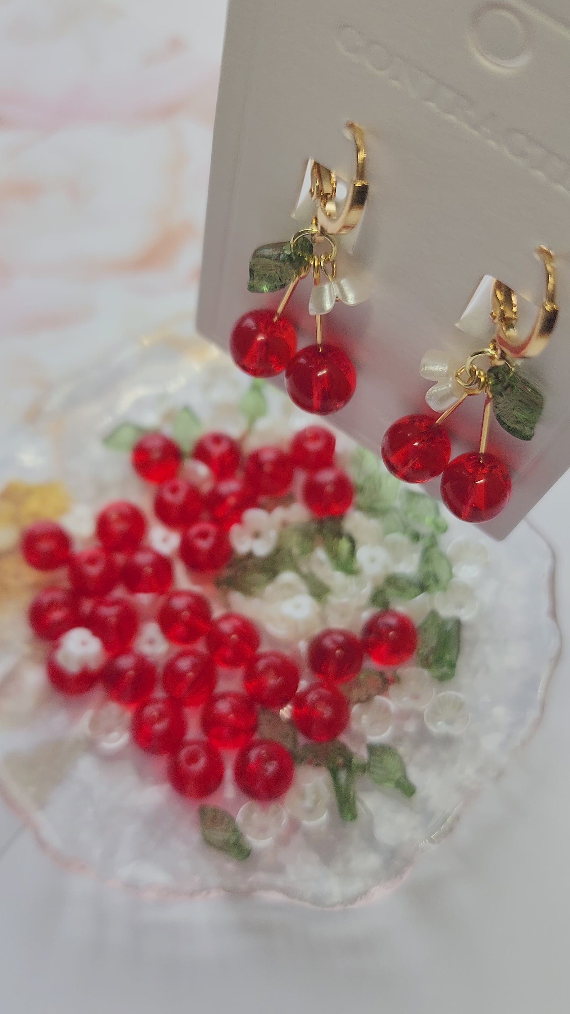 Nuestro precioso pendiente de cristal con forma de cereza está hecho con cerezas de cristal y ganchos para pendientes/aros tipo aro chapados en oro que son buenos para orejas delicadas.