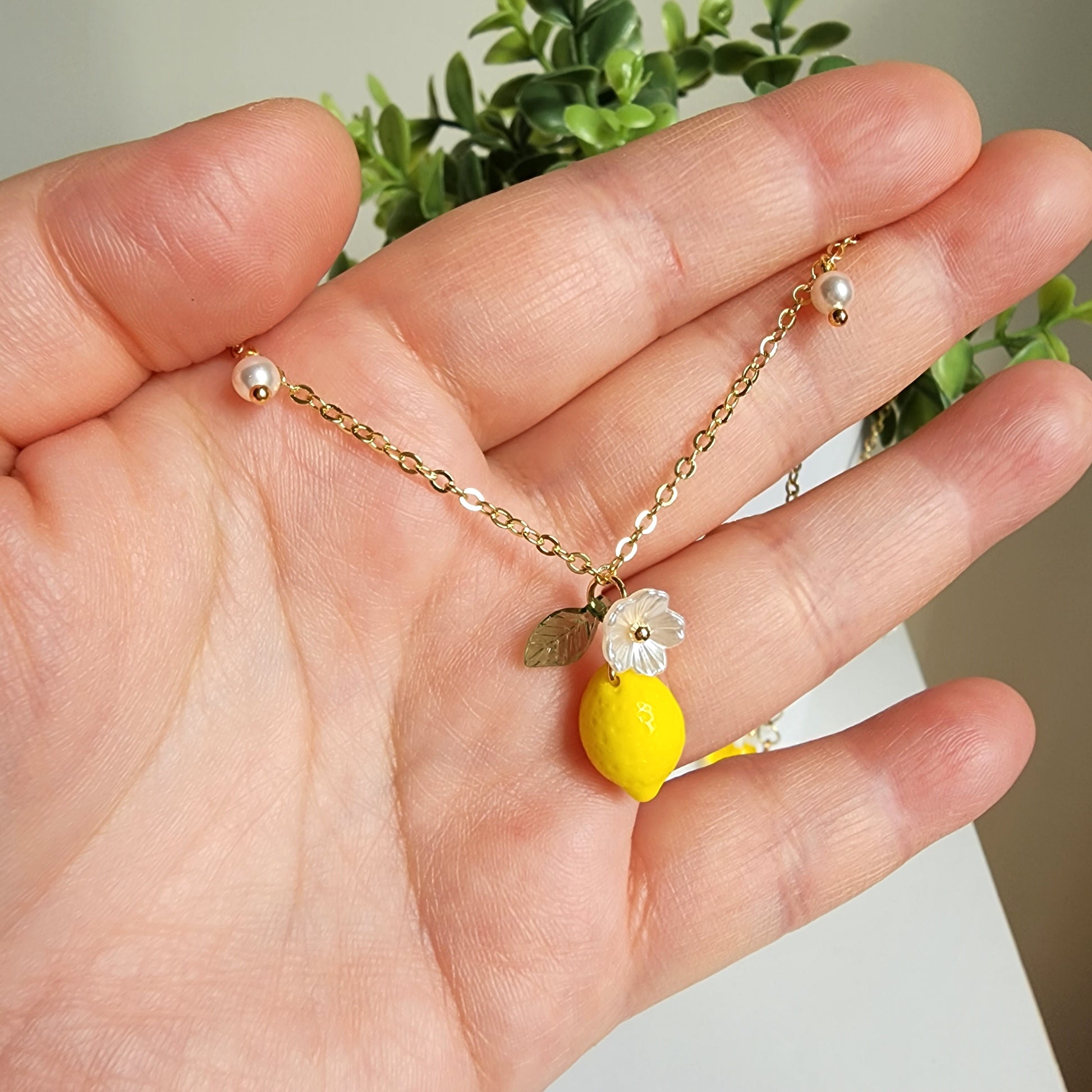 The bracelet is made with glass fruits, artificial pearl, crystal bead and 14K gold plated chain. The chain is 7" long with 1.25" extender.