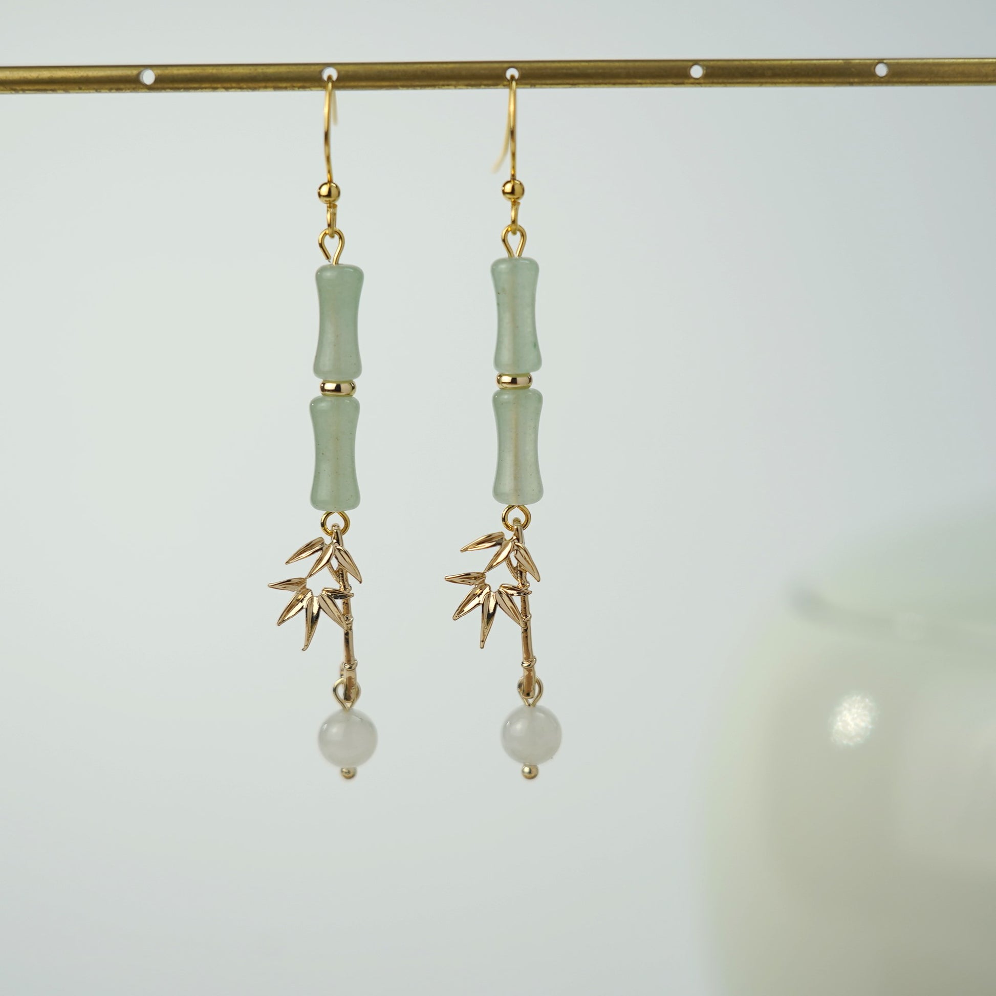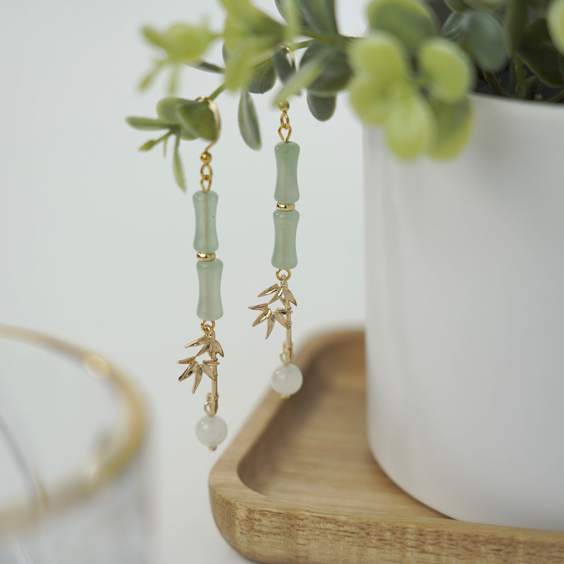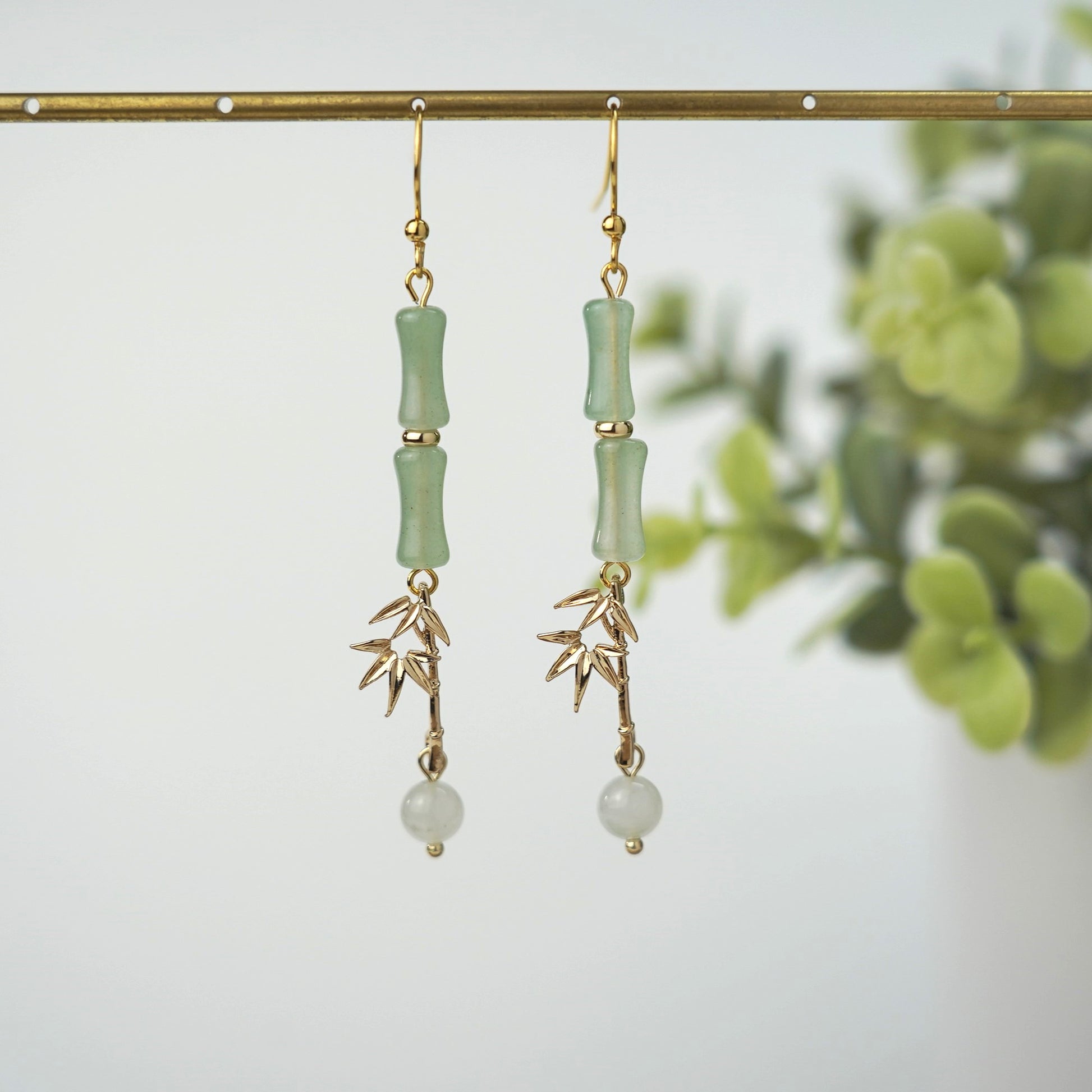 - Material: The bamboo leaf dangle earrings are handmade with natural jade bamboo, gold plated bamboo leaves, jade beads and 14K gold plated ear hooks which are hypoallergenic.