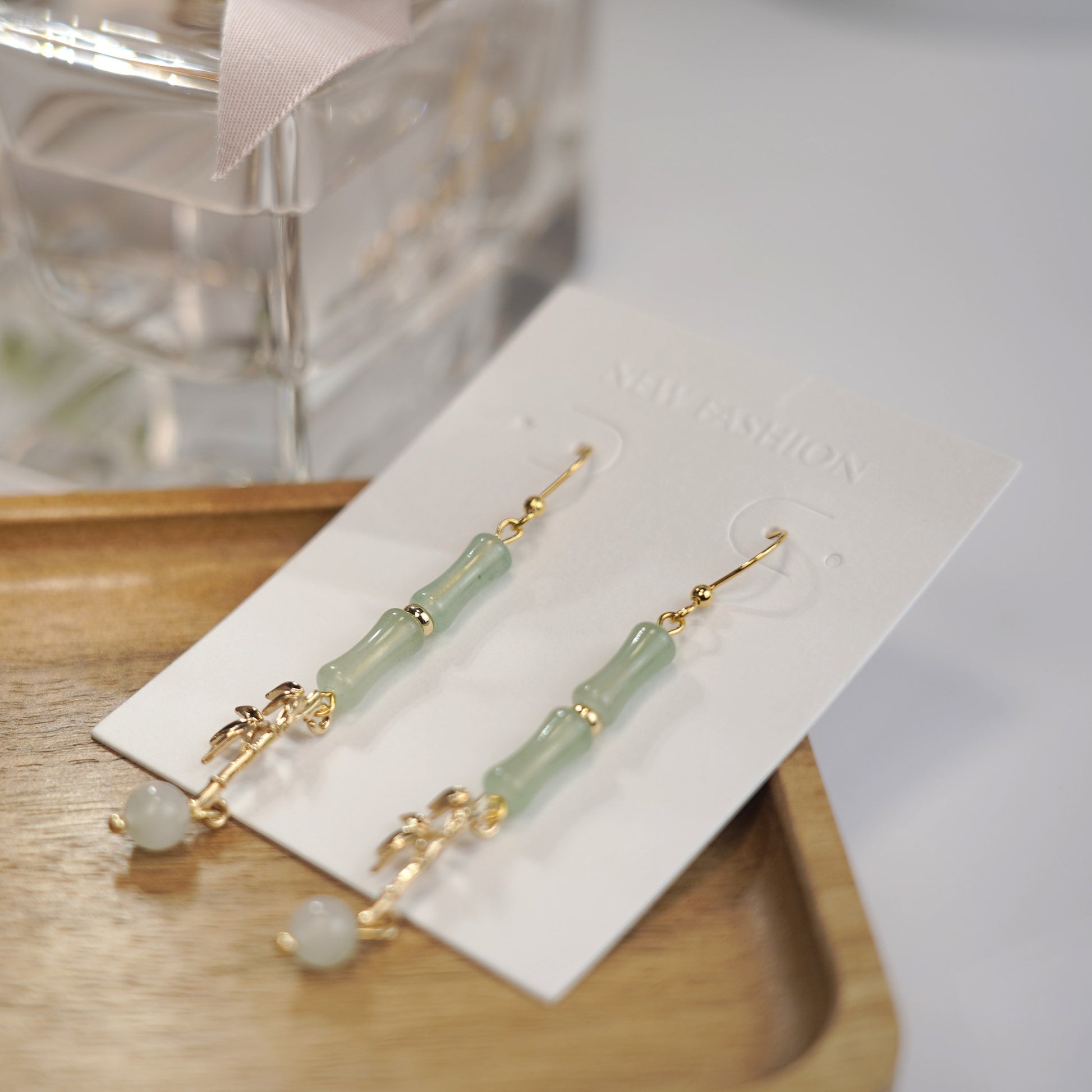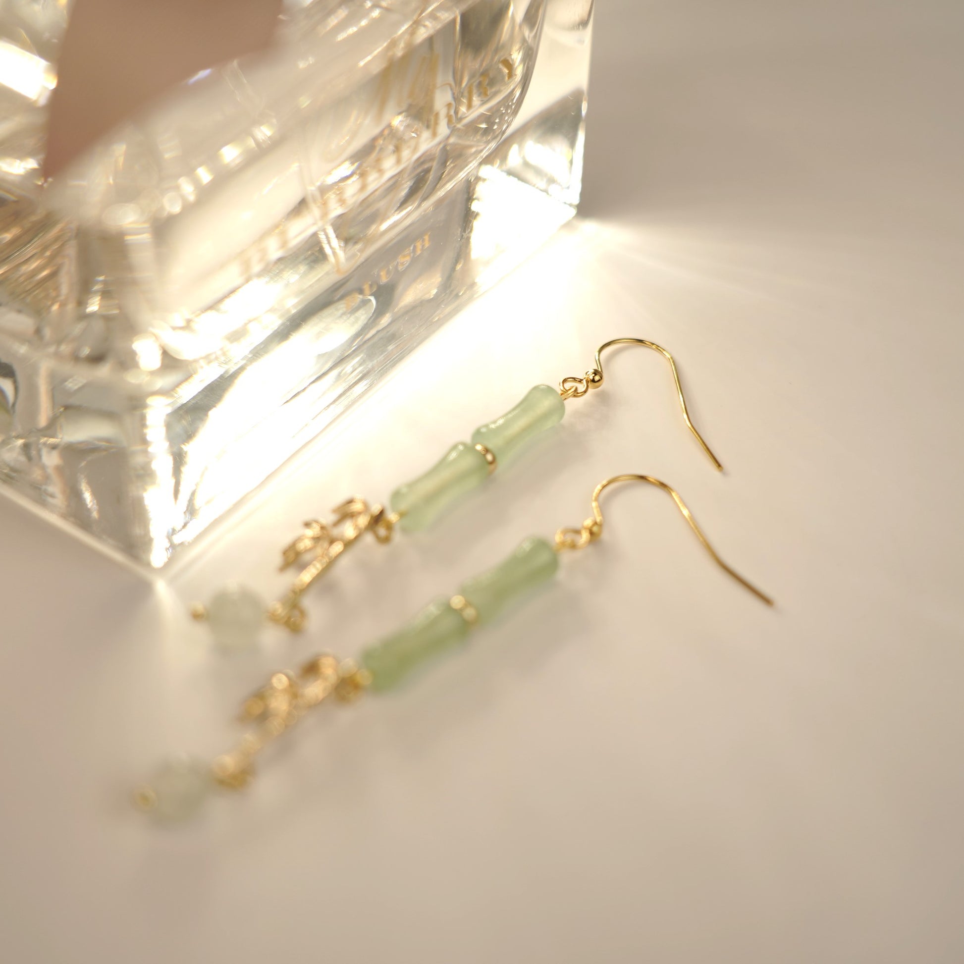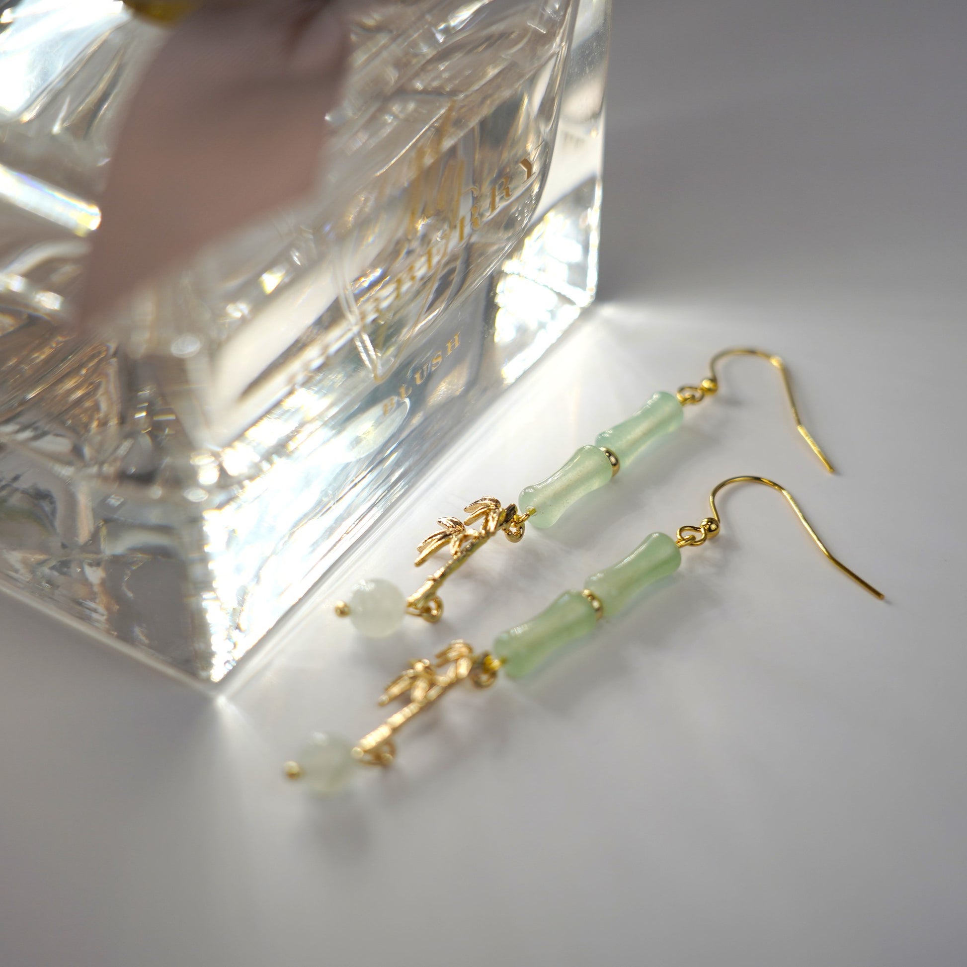 - Material: The bamboo leaf dangle earrings are handmade with natural jade bamboo, gold plated bamboo leaves, jade beads and 14K gold plated ear hooks which are hypoallergenic.