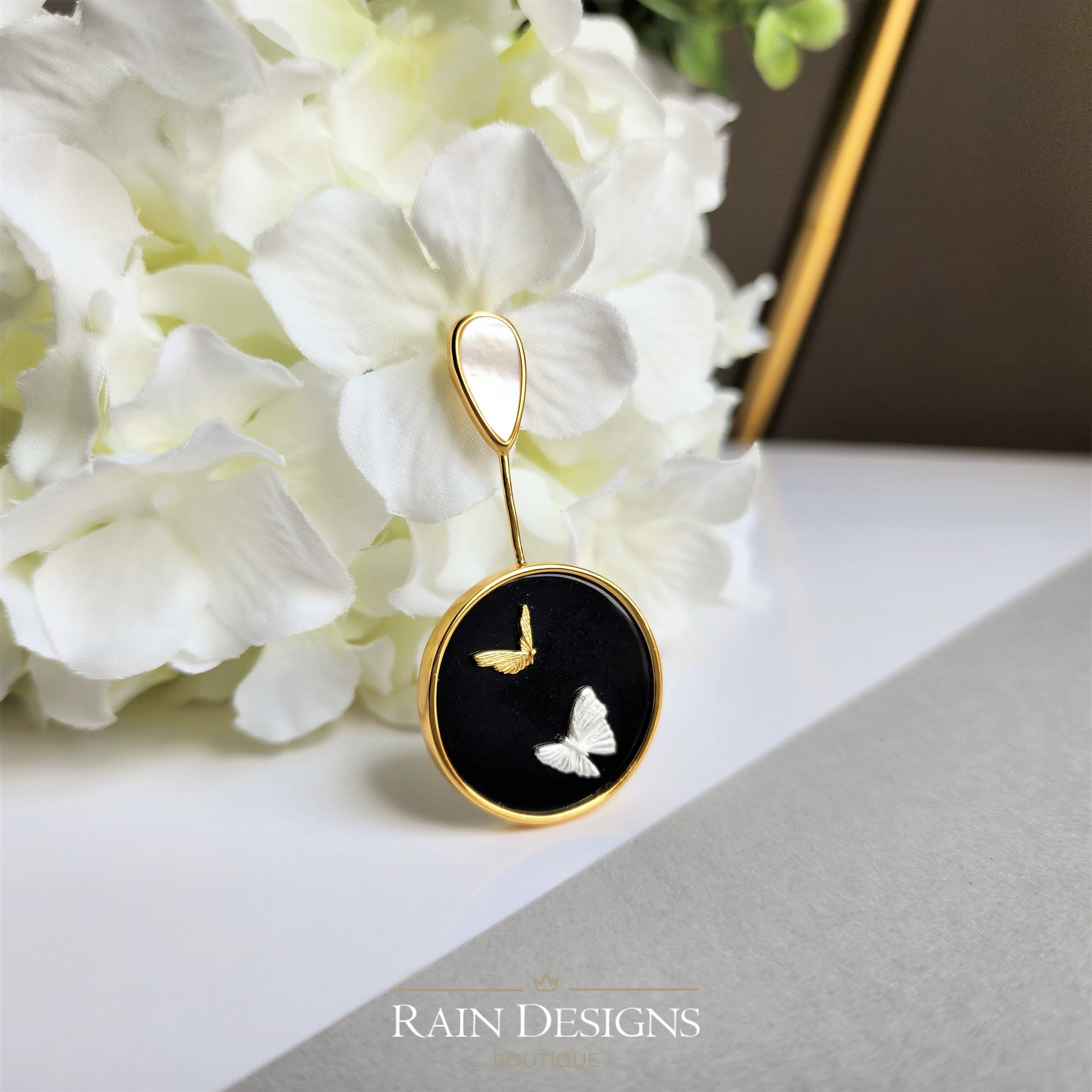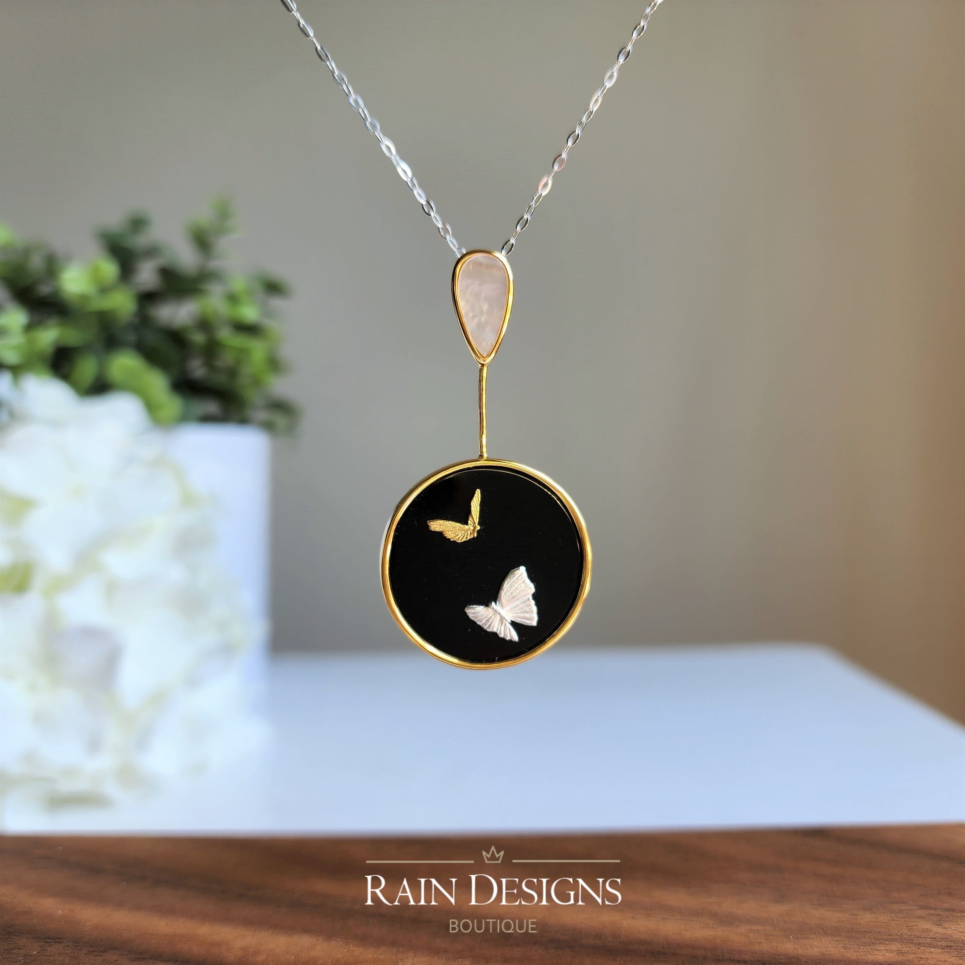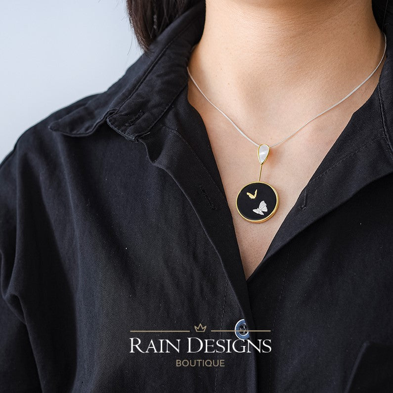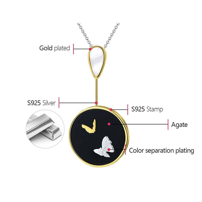 Our beautiful butterfly agate necklaces are made with 18K gold and silver butterflies, natural black agate, mother of pearl, 18K gold plating and 925 sterling silver which are good for delicate skin. The necklace chain is high shine 925 sterling silver which is hand crafted in India.