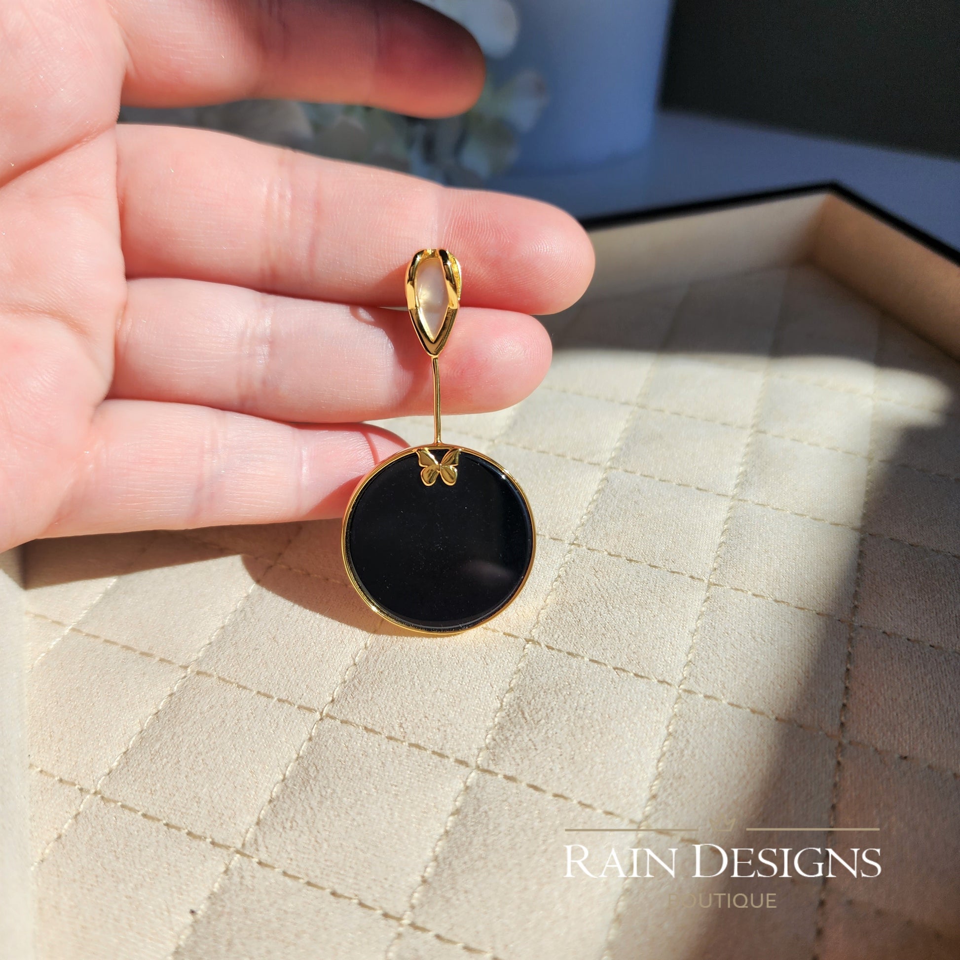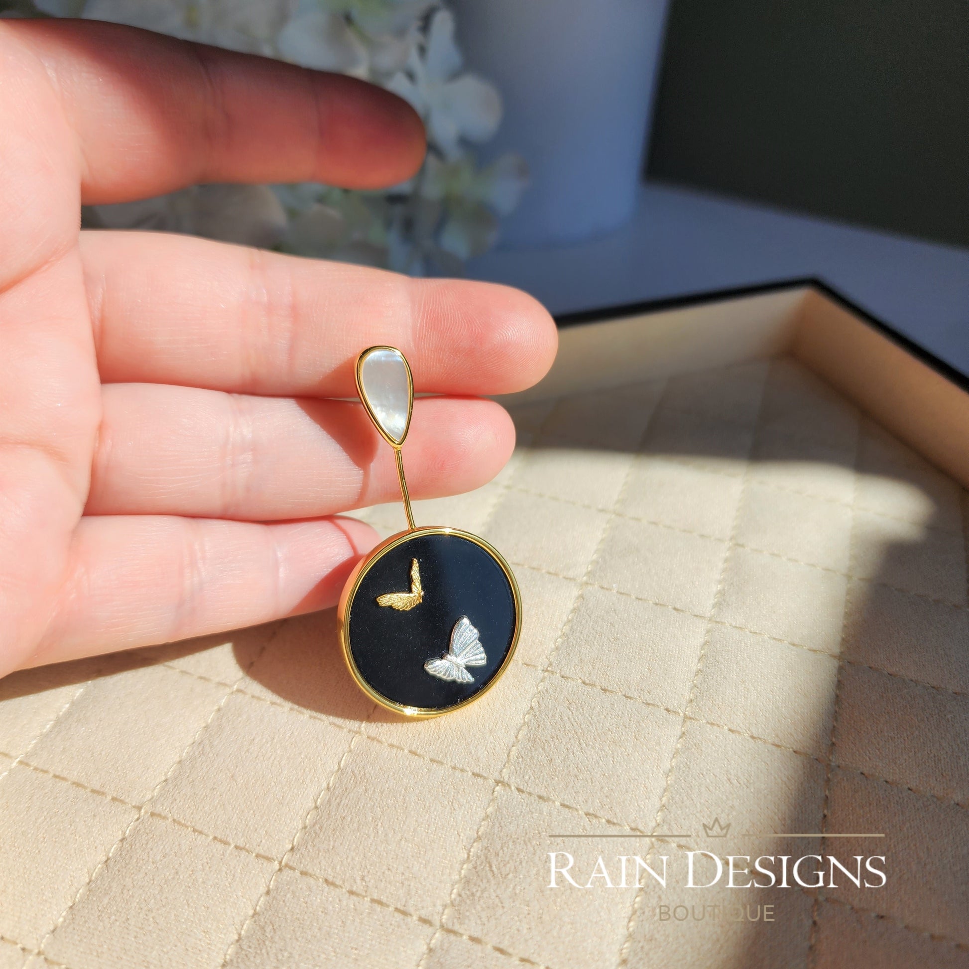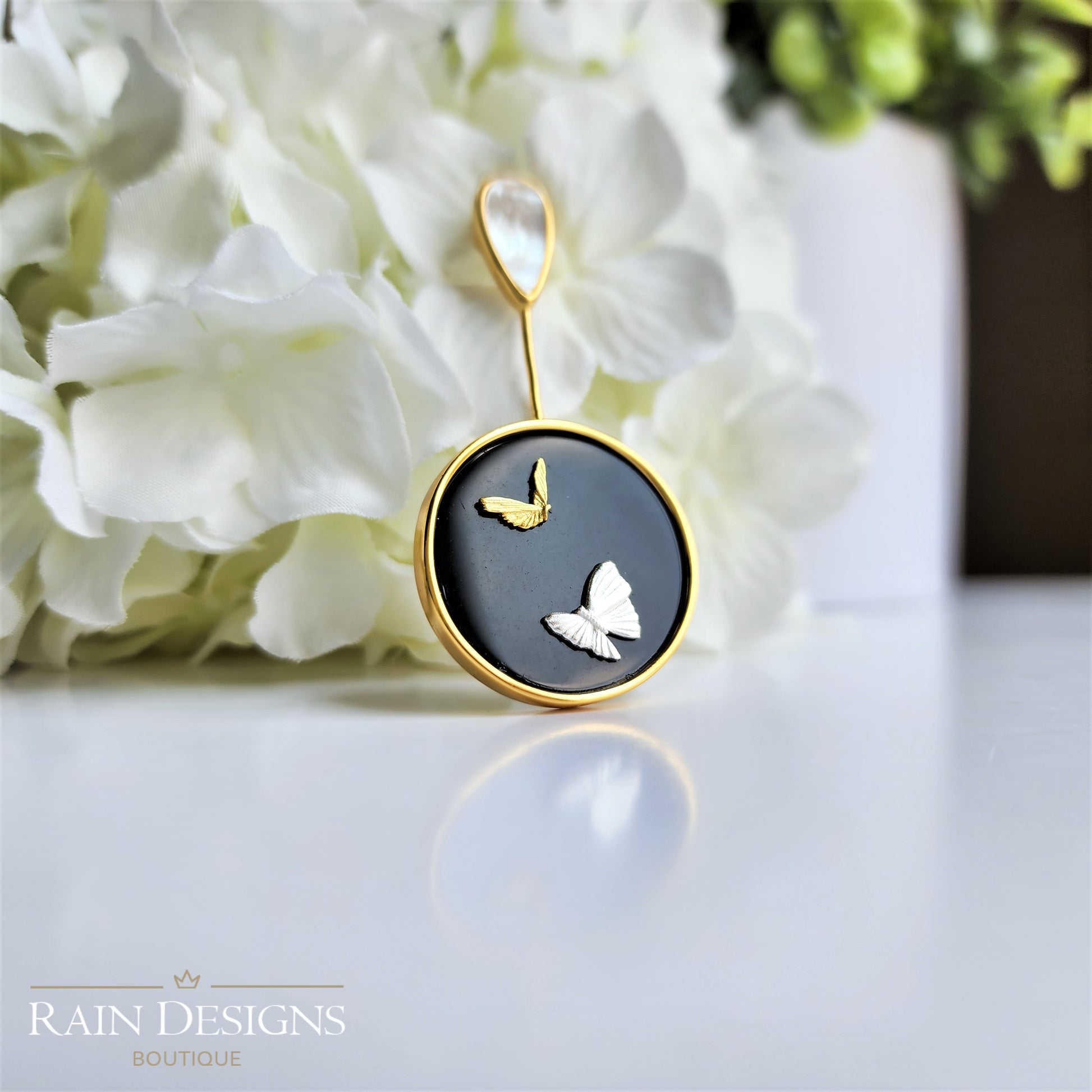 Our beautiful butterfly agate necklaces are made with 18K gold and silver butterflies, natural black agate, mother of pearl, 18K gold plating and 925 sterling silver which are good for delicate skin. The necklace chain is high shine 925 sterling silver which is hand crafted in India.