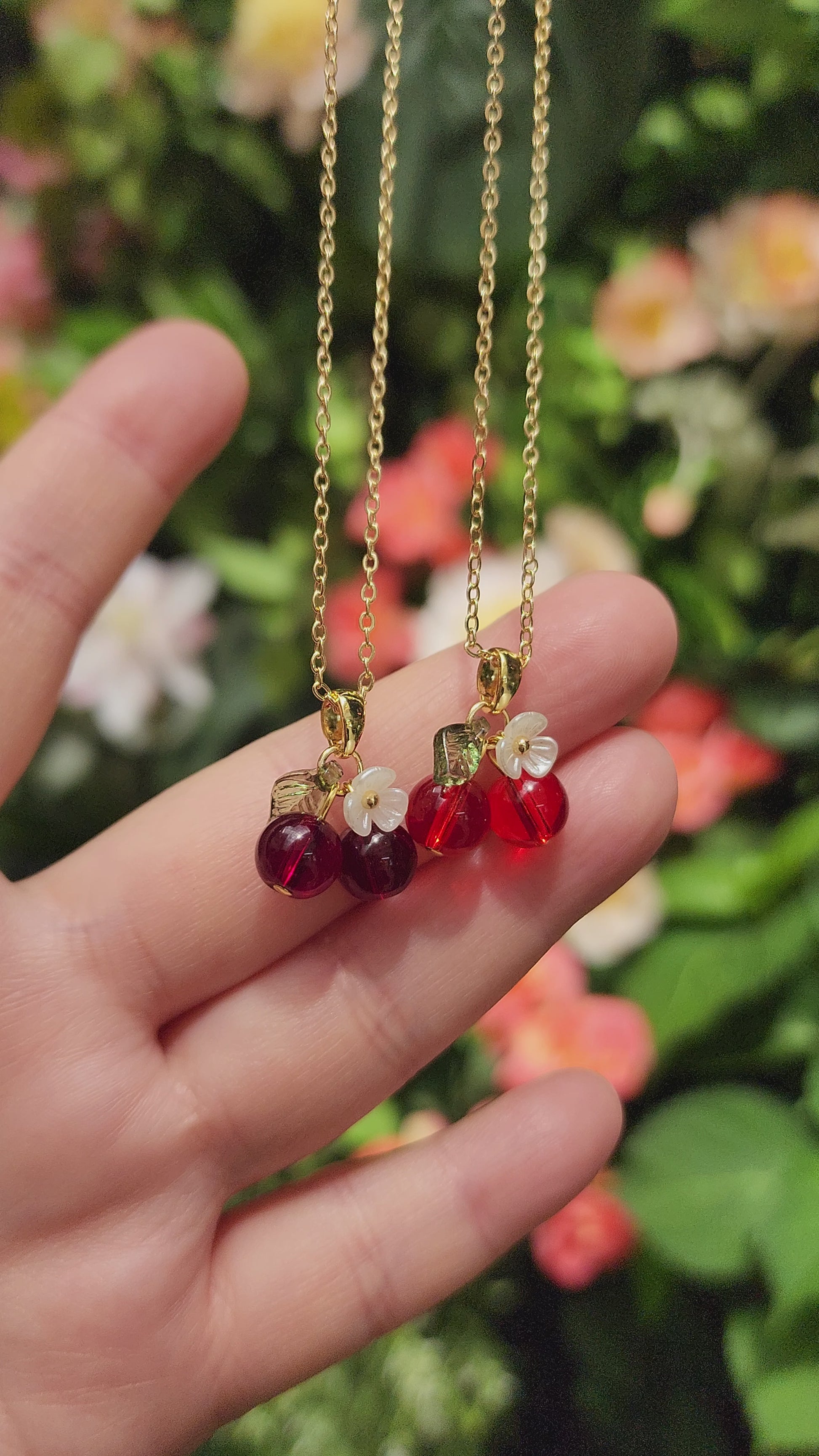 Material: Our sweet cherry necklaces are handmade with glass cherries, acrylic flowers, acrylic leaves and 14K gold plated(hypoallergenic) chains. This necklace is a great match for our cherry earrings. The silver version is available as well. Please contact us for details.