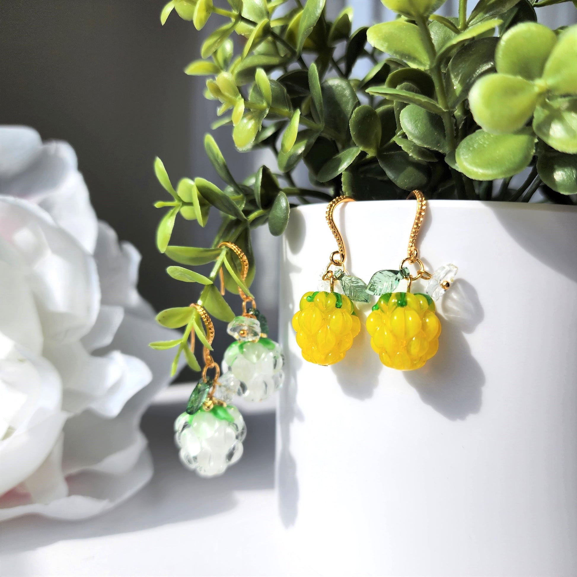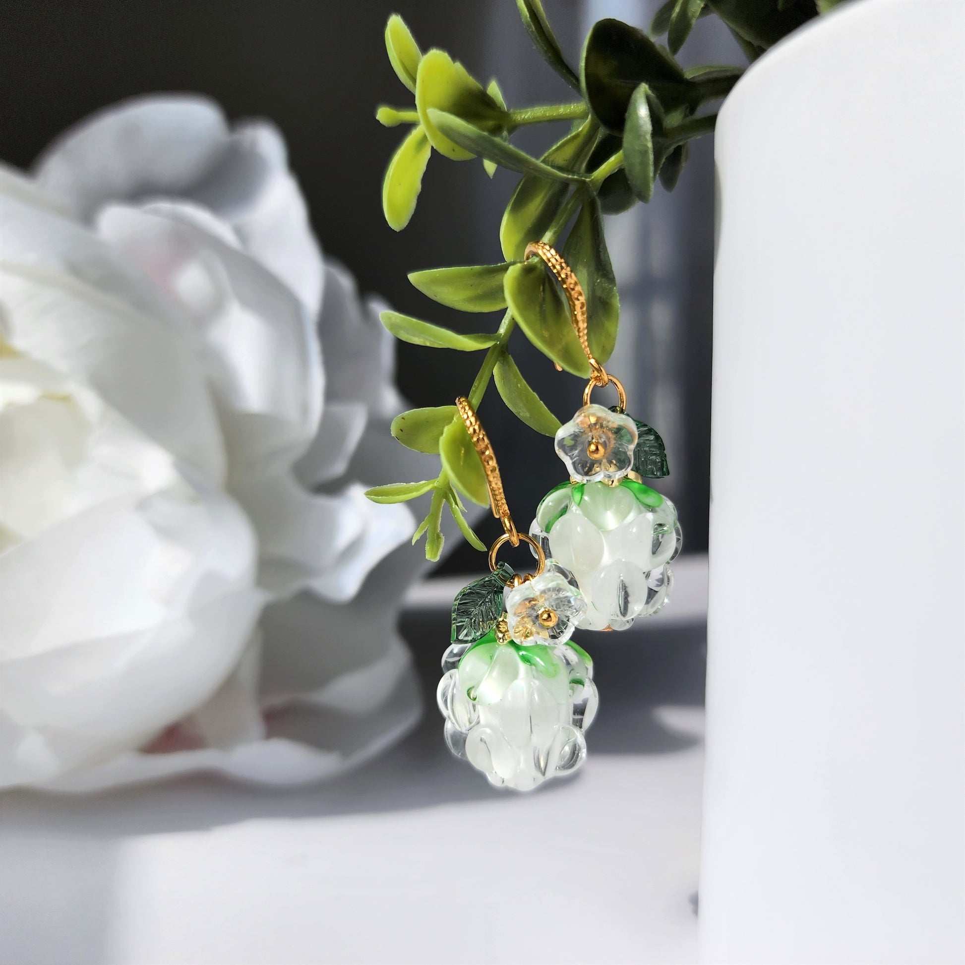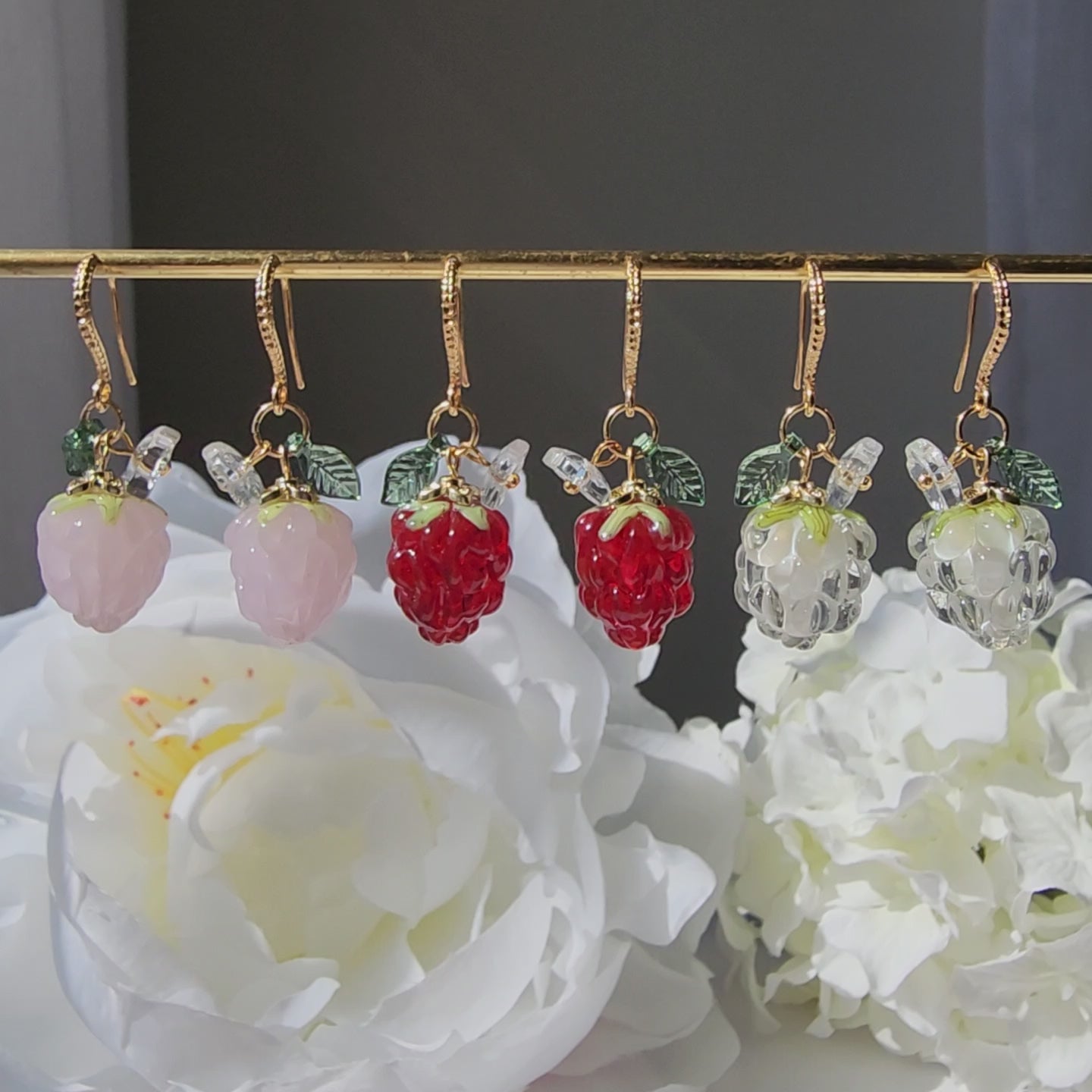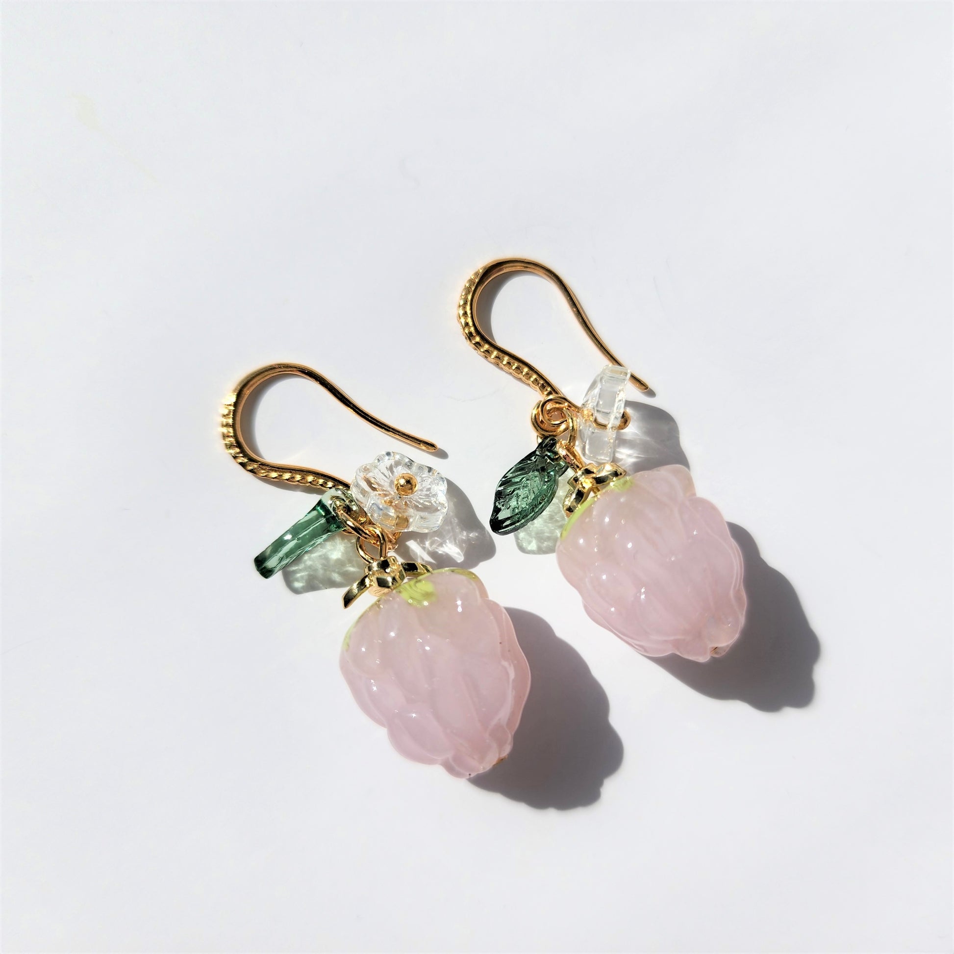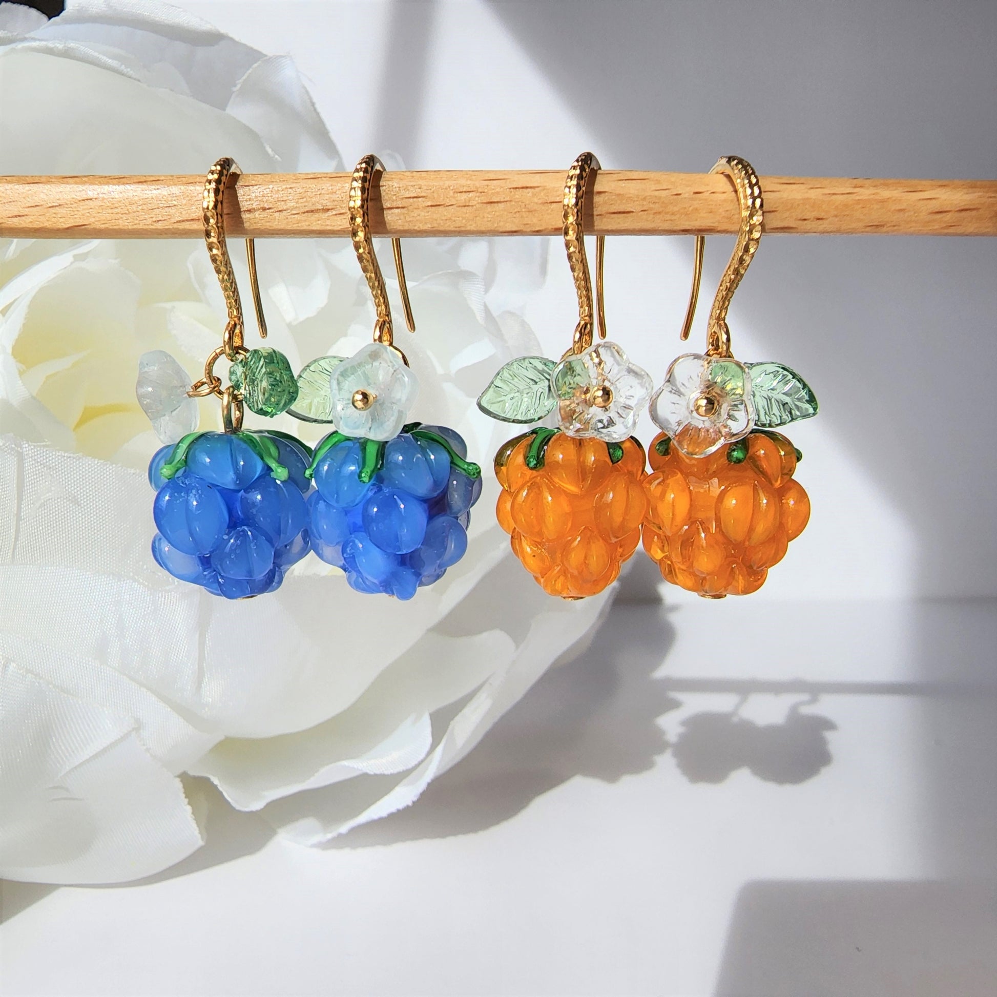 Our cute cloud berry with flower earrings are made with half transparent glass berries, glass flowers and 14K gold plated earring hooks which are good for delicate ears.