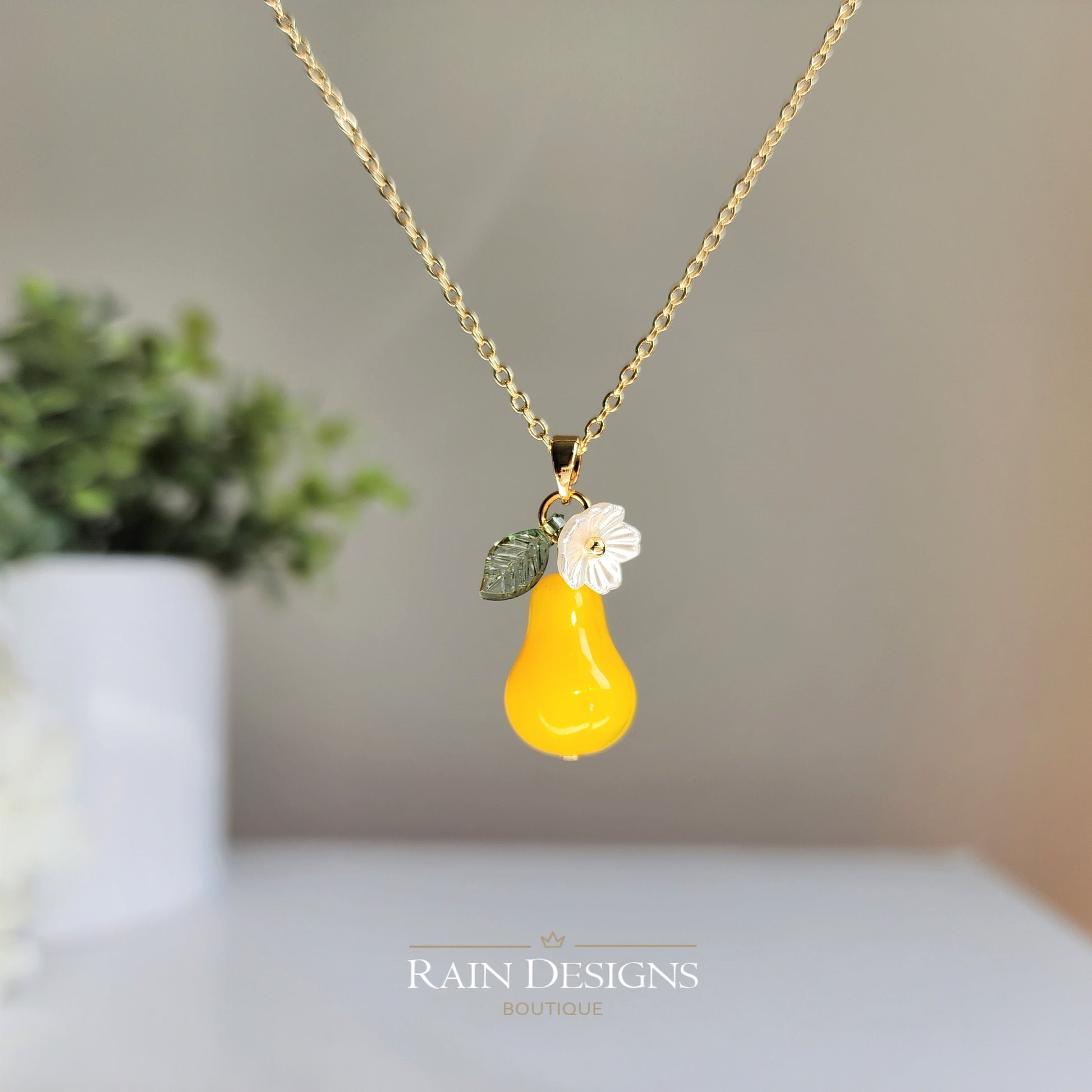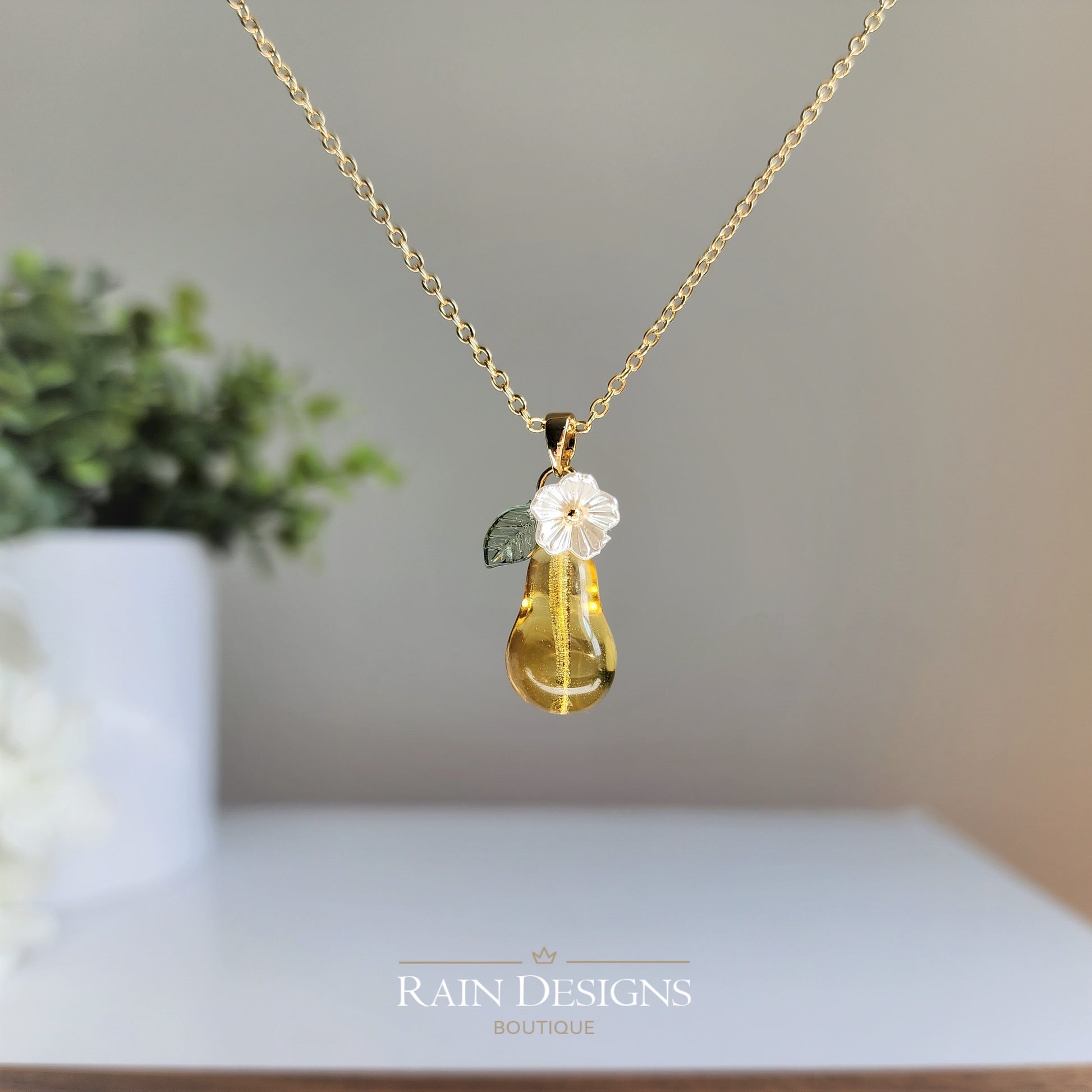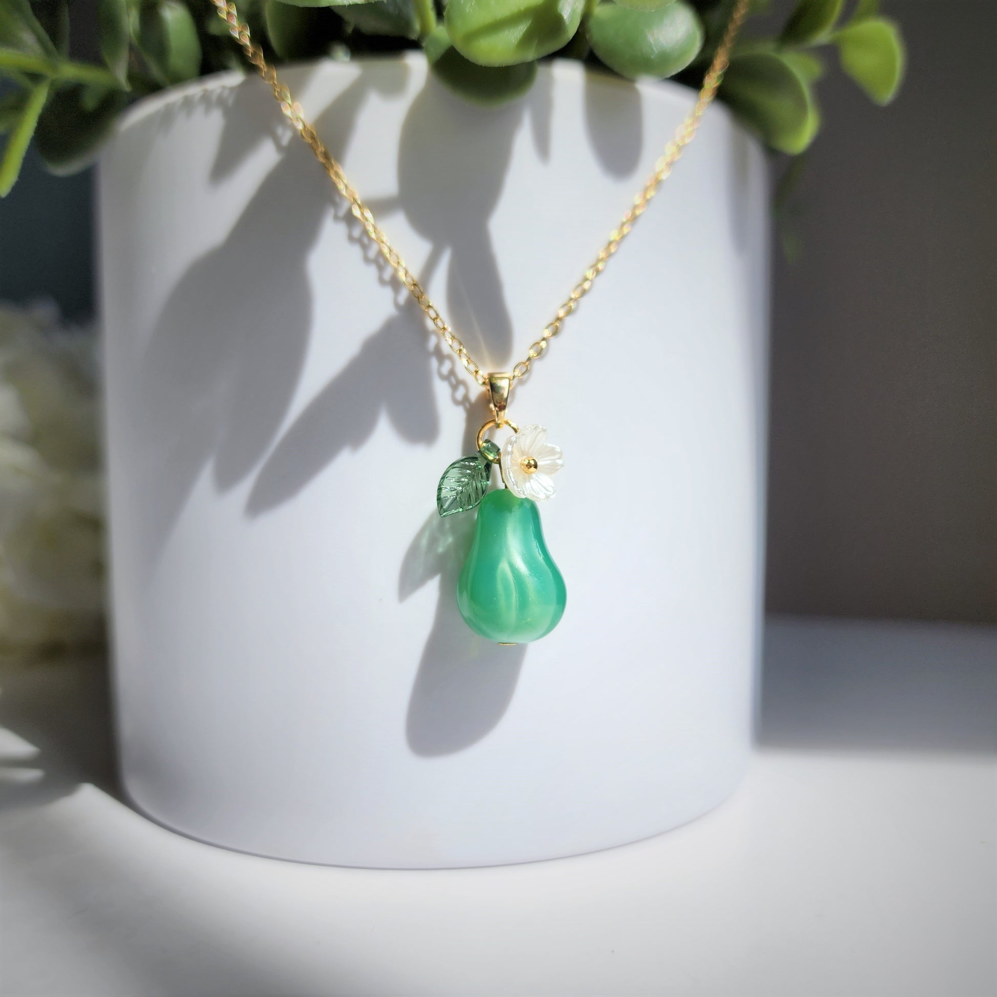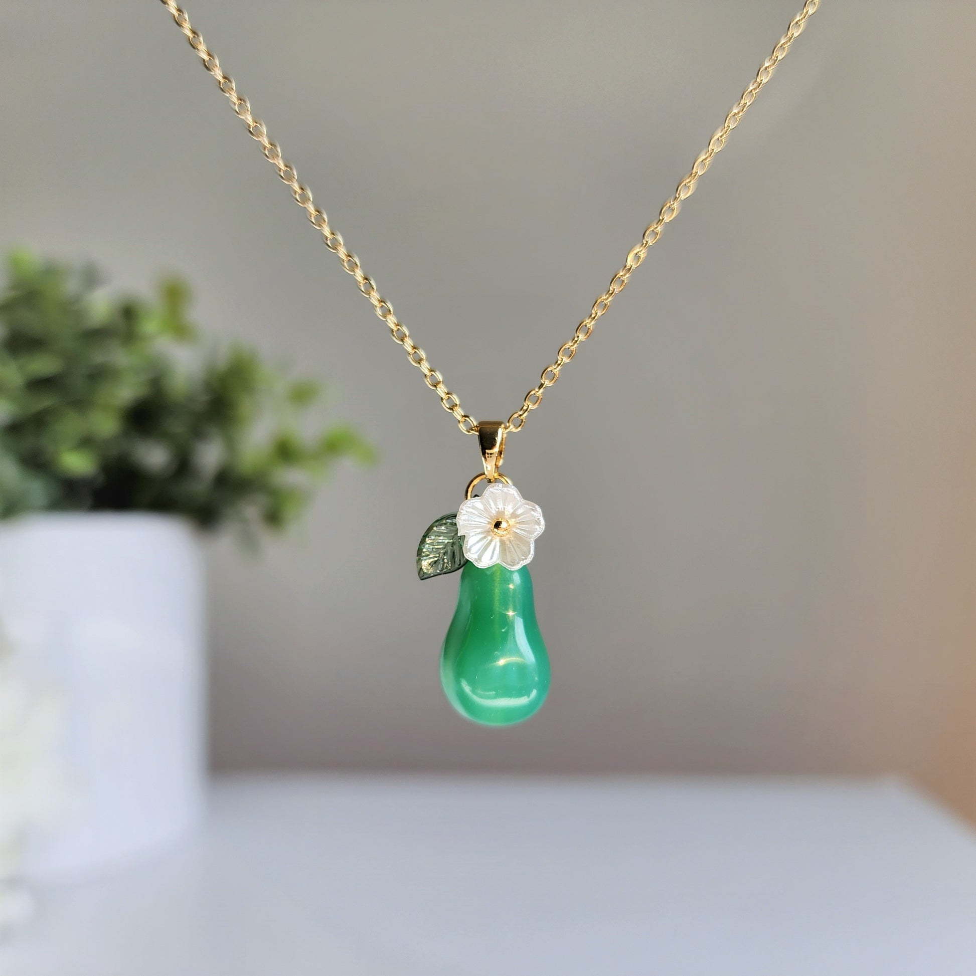 Discover the elegance of a large pear necklace in our latest article. Learn about the history of this timeless accessory and how to style it for any occasion. Our large pear necklaces are handmade with high quality glass pears, acrylic flowers and leaves, and 14K gold plated necklace chain. If you'd like 925s silver plated or pure silver version, we can make it to order. Please check our custom design options.