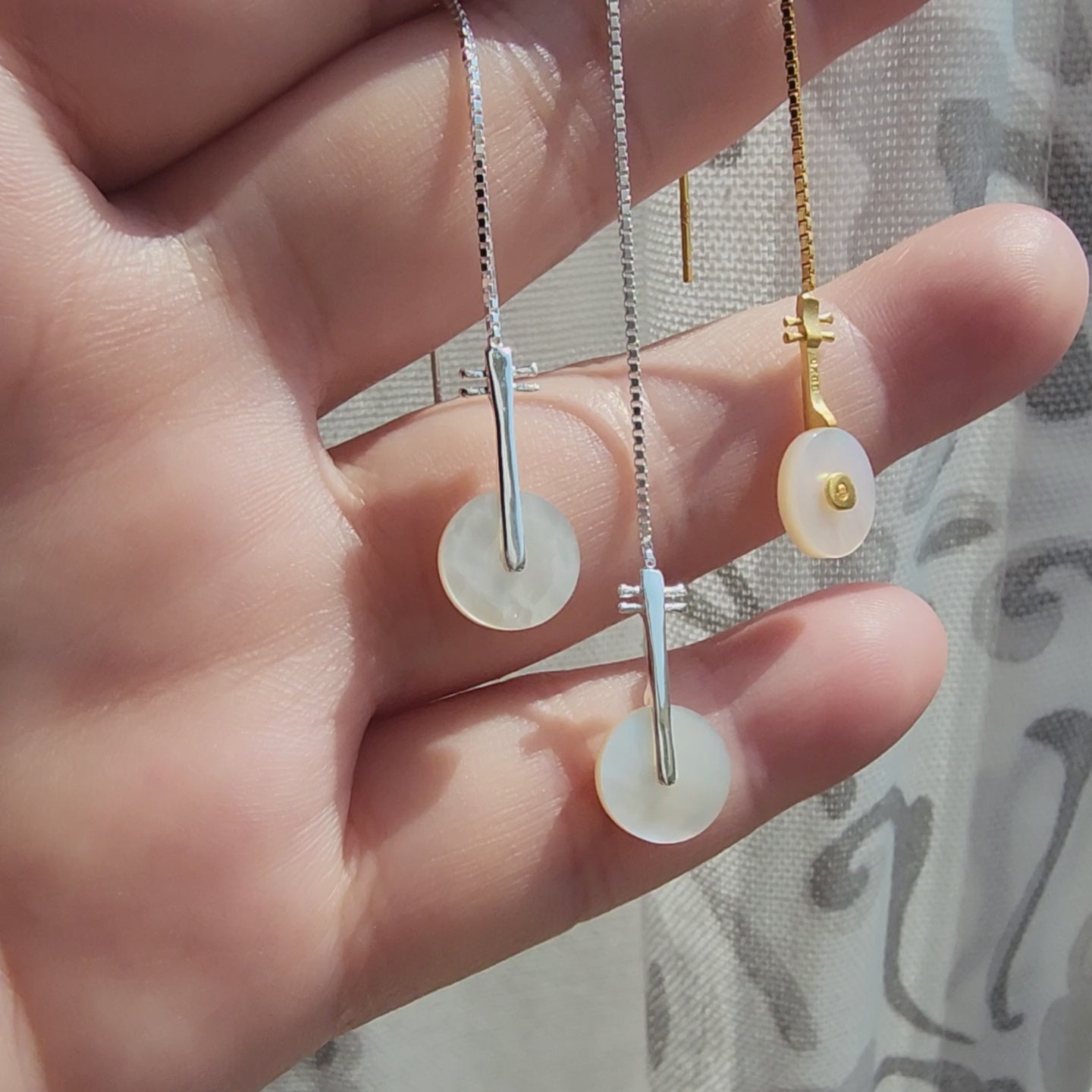 Pipa is a traditional Chinese lute with a pear-shaped body, short neck, and four strings. Our Pipa thread earrings are handmade with natural shell pear-shaped body, premium 925 sterling silver short necklace and 925S silver thread. The gold color Pipa is handmade with 18K gold plated 925 sterling silver, the same premium material, hypoallergenic.