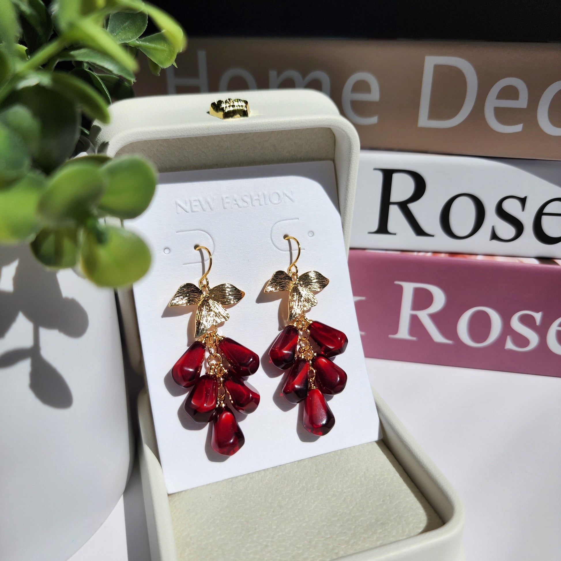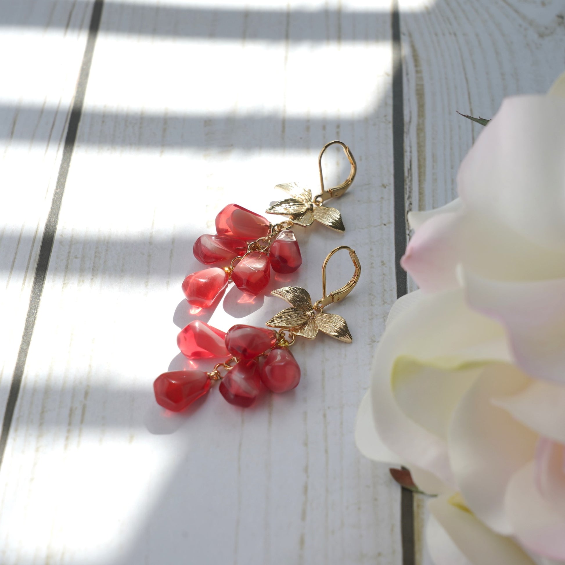Our pomegranate seed fruit earrings got a lot of compliments. They are handmade with rich color resin pomegranate seeds, gold plated leaves, and 14K gold plated earring hooks which are good for delicate ears. Would you like to make a set? We have matching necklaces. You choose the design, we handmade with love.