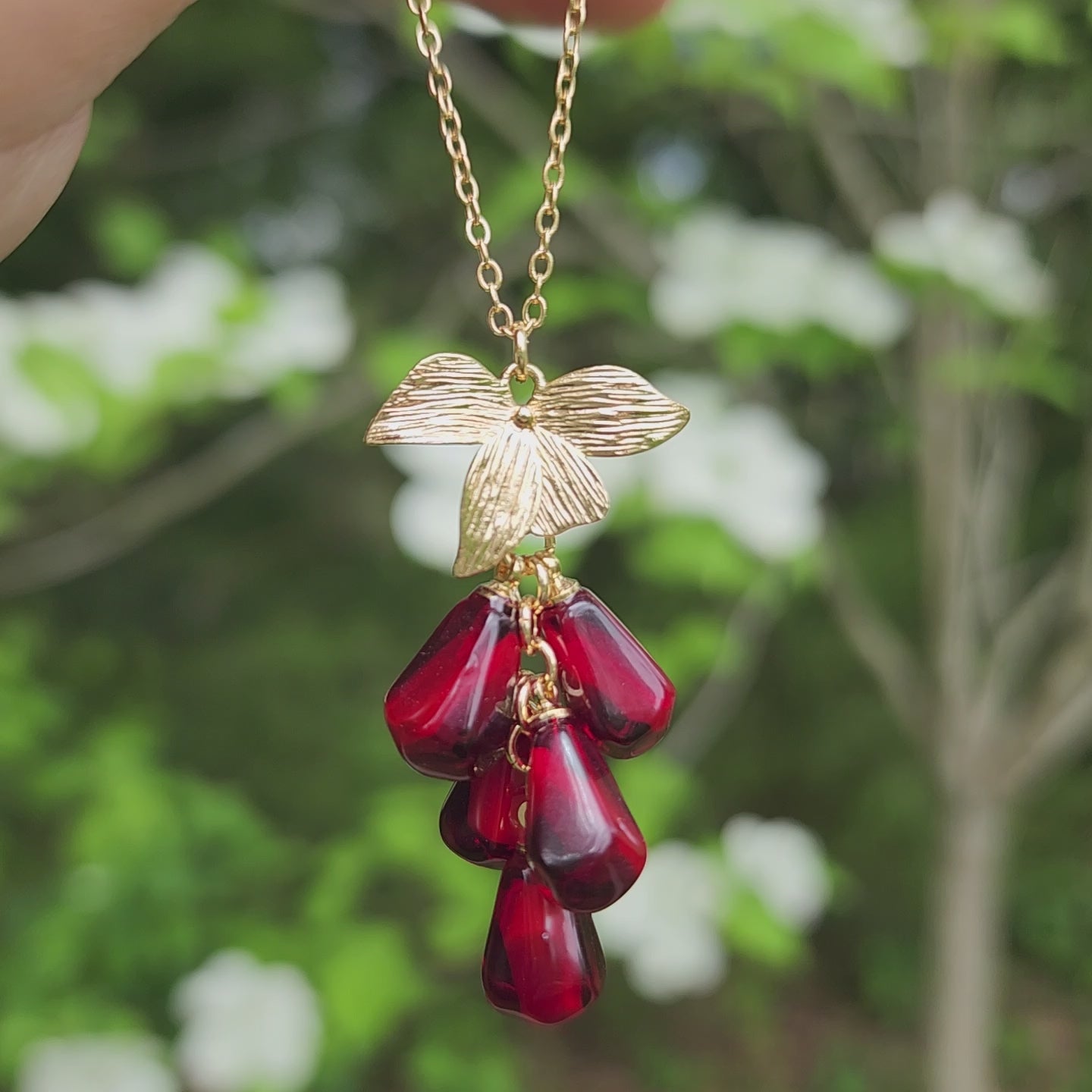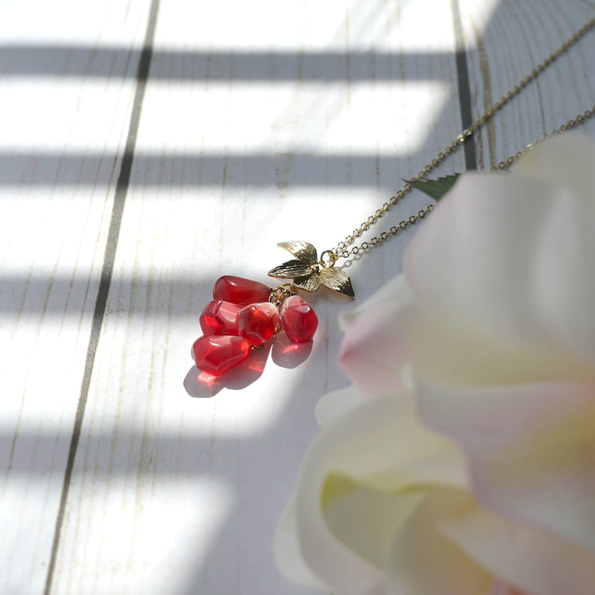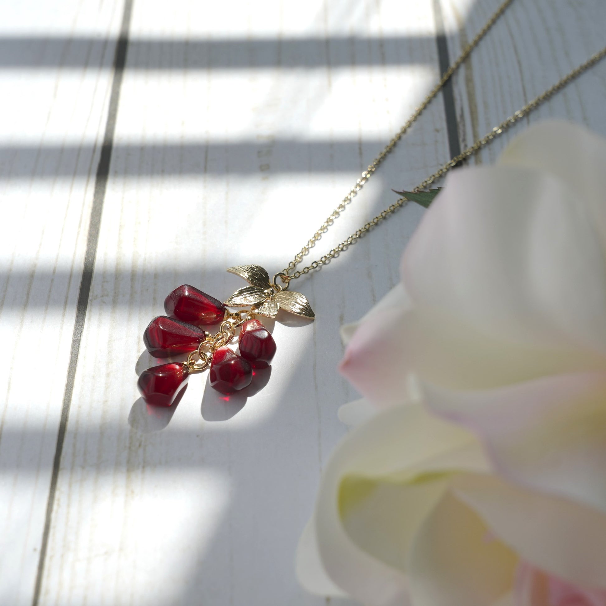 Our cute pomegranate seed necklace is made with 14K gold plated leaves, resin pomegranate seeds and 14K gold plated necklace chain which are good for delicate skin.