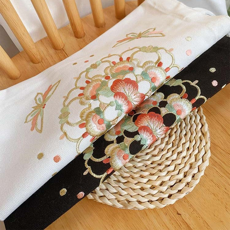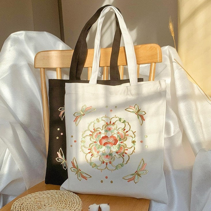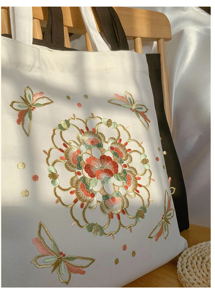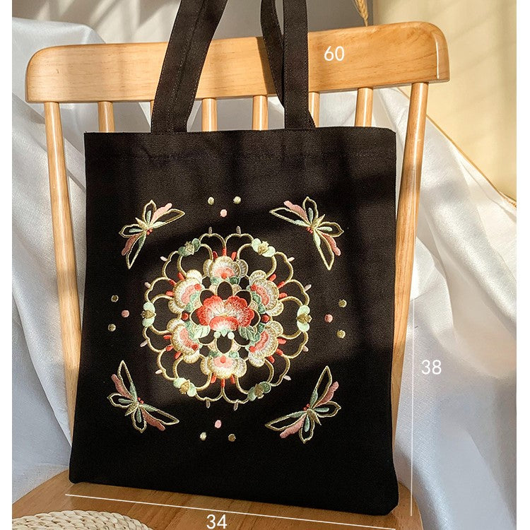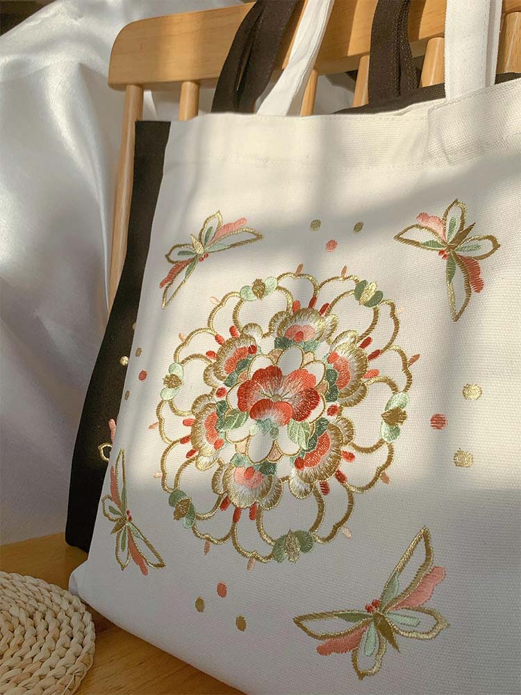 This silk floral medallion embroidered tote bag is designed for this holiday season. This bag is carefully made by my mother with silk flower embroidery and 16 oz canvas fabric. This fabric is durable and suitable for everyday use.