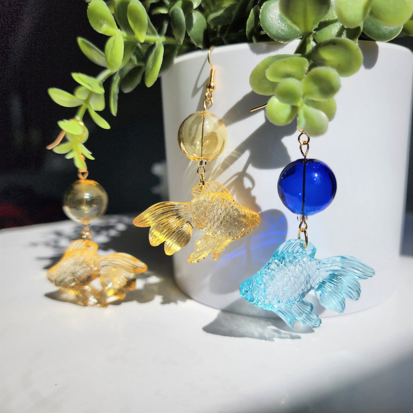 Our transparent goldfish dangle earrings are made with resin goldfish, glass bubbles and 14K gold plated earring hooks which are good for delicate ears.