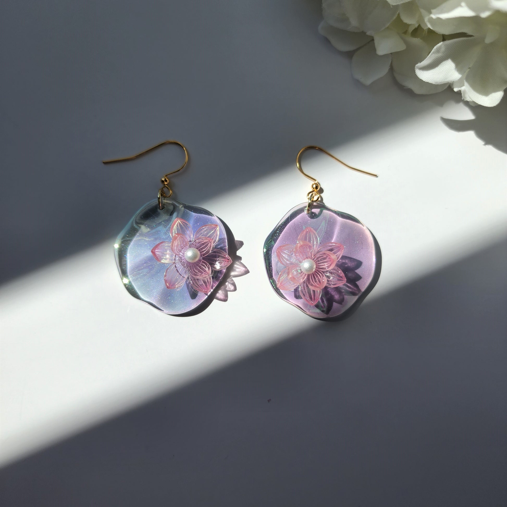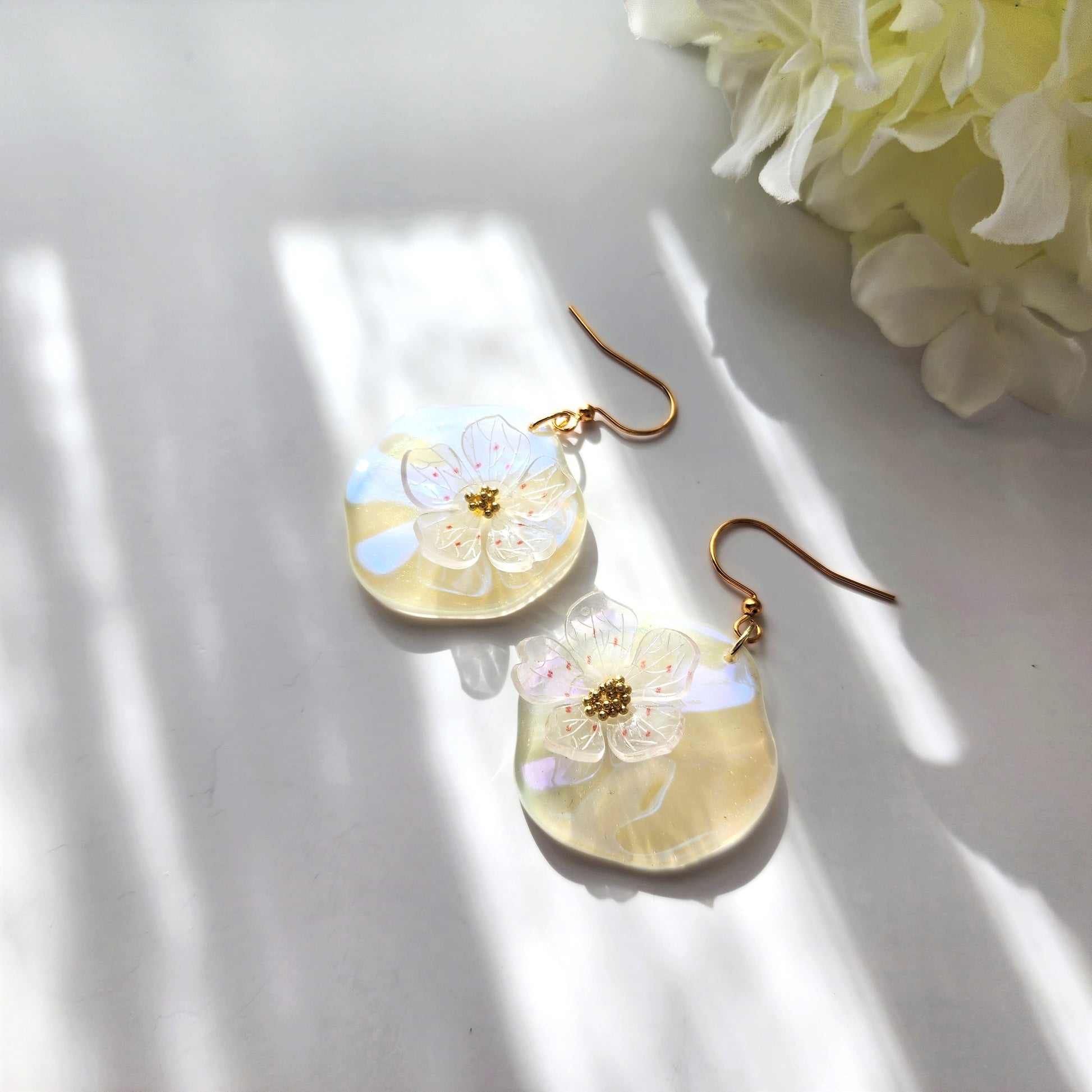 Our beautiful floating water lily dangle earring is made with acrylic water lily, acrylic leaves and 14K gold-plated hook/hoop which are good for delicate ears.